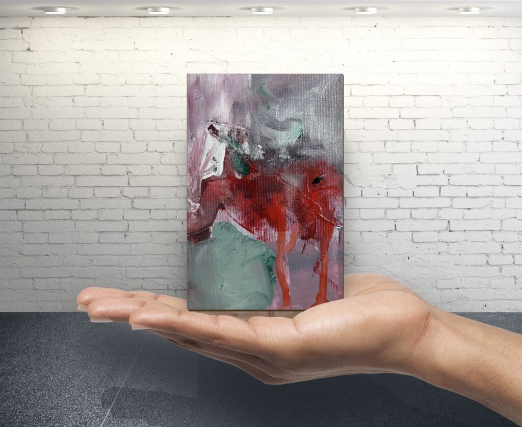 Acrylic paint and/or oil paint on canvas mounted on a woodpanel for a flexible and cool presentation of one or more artworks directly on your wall.
